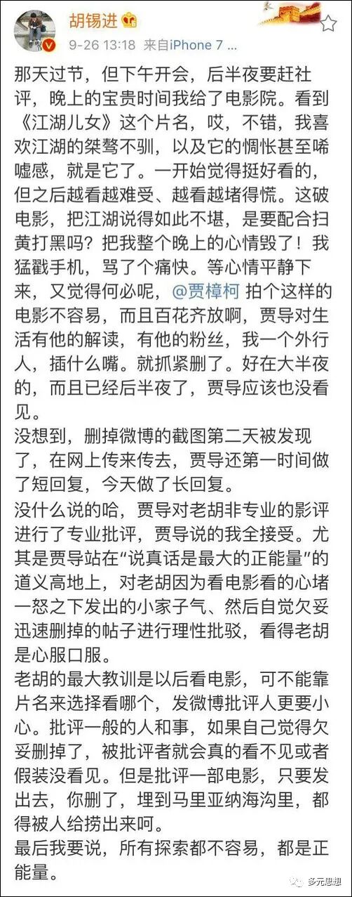 9月24日,在中国大陆首映的第四天,环时的胡编总慕名去看完电影以后,在微博上发了一篇评论,说《江湖儿女》的“”灰暗镜头“”“充满了负能量”,是“一块臭豆腐”,“好人不得好报”的故事让他添了堵。。。。。。