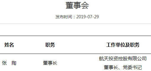 不仅百度百科没有,而且在其他相关的网站上也搜不到。即便进入到航天投资控股有限公司的网站www.caih.cn,找公司高管的介绍,也没有张陶的履历信息。但如果点击里面的“关于我们”,看董事会的构成,张陶确实是一把手。