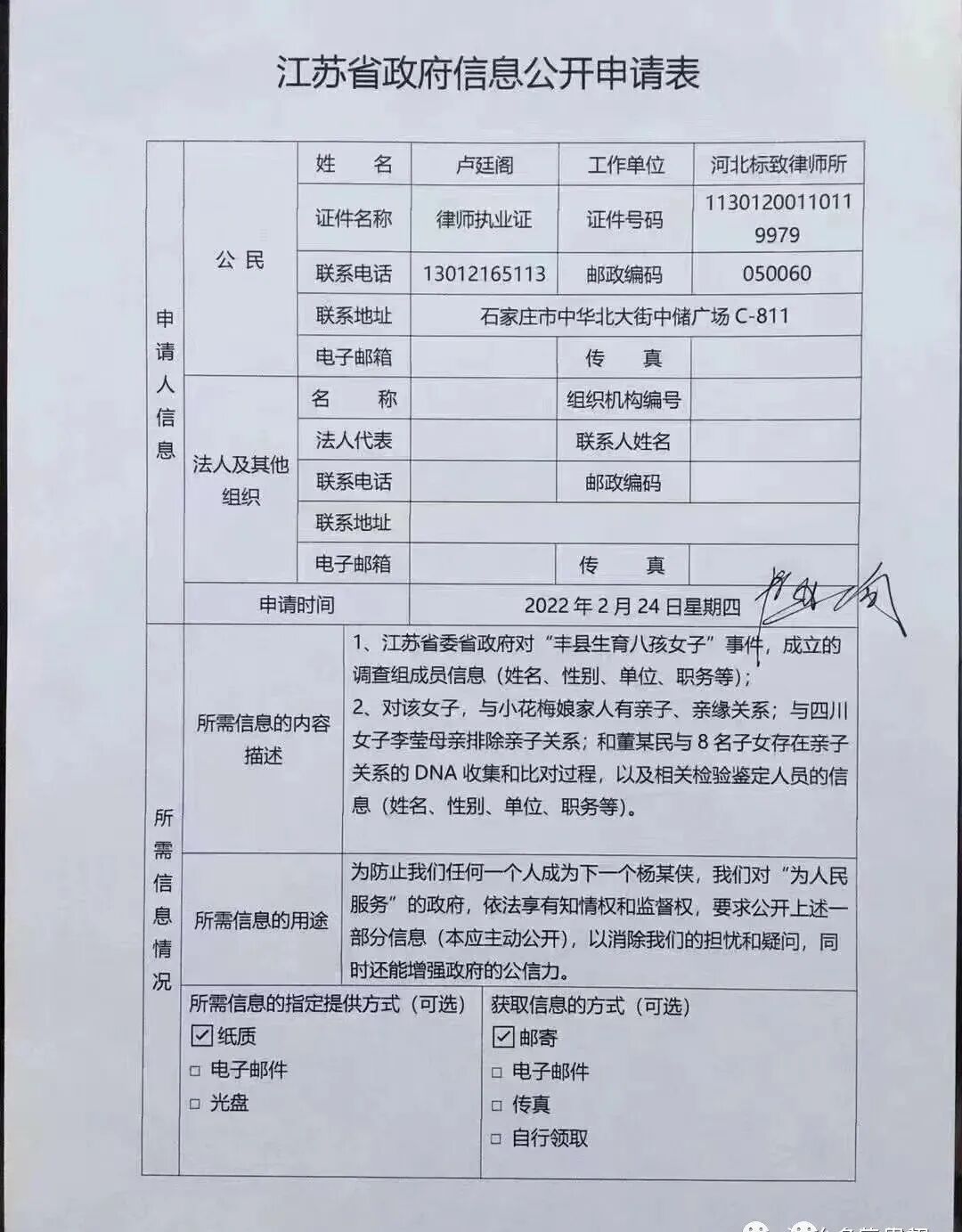 网络上对江苏省省级调查组的这份与徐州第三份发布结论几乎完全相同的报告提出了更多的质疑,但至今没有任何回应,为此,河北省标致律师事务所的卢廷阁律师,向调查组发出了一份正式的《政府信息公开申请表》:![]()