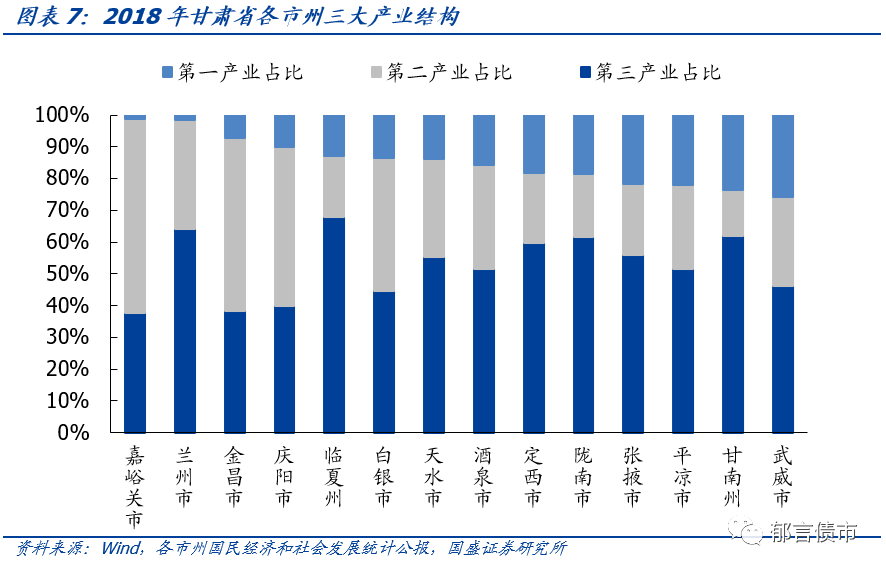 产业格局方面,除庆阳市、嘉峪关市和金昌市为“二三一”,甘南州为“三一二”外,其余各市州皆为“三二一”的产业结构。第一产业方面,武威市、甘南州和平凉市占比较高,分别为25.7%、23.7%、22.2%;第二产业方面,嘉峪关市、金昌市、庆阳市占比较高,分别为61.1%、54.5%、50.2%;第三产业方面,临夏州、兰州市、甘南州占比较高,分别为67.9%、64.1%、61.8%。