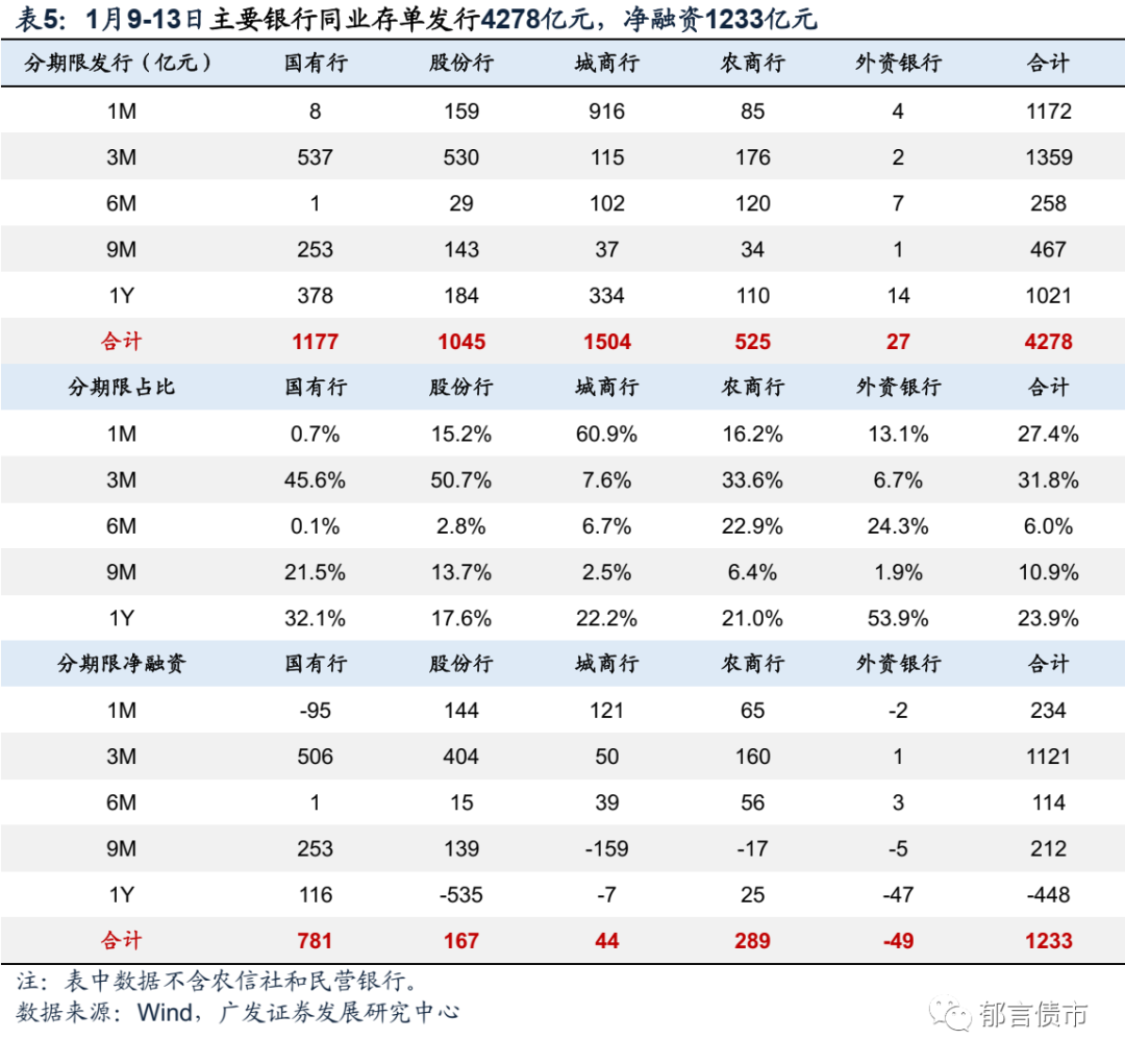 主要银行同业存单净融资1233亿元。1月9-13日,主要银行同业存单发行4278亿元(不含农信社和民营银行),净融资1233亿元,连续第四周为正。1月2-6日,主要银行同业存单发行1107亿元,净融资306亿元。