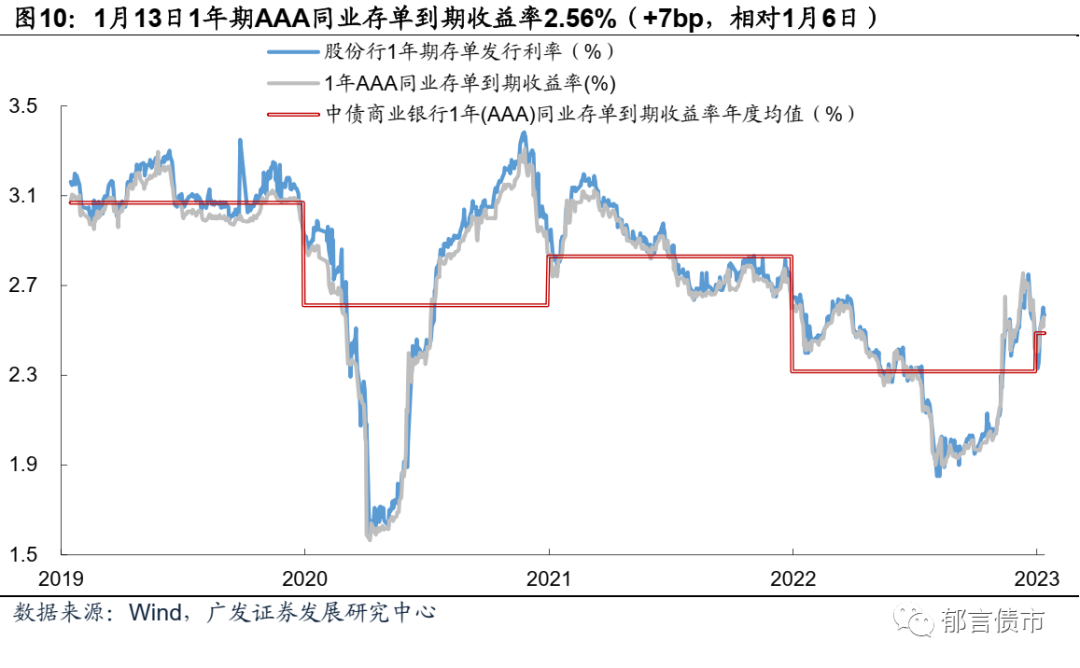 1年期AAA存单收益上行至2.56%。二级市场方面,本周1年期AAA同业存单收益率整体上行,周五上升至2.56%,较上周五上行7bp。一级市场方面,股份行1年期存单发行利率1月13日为2.57%,较上周上行17bp。