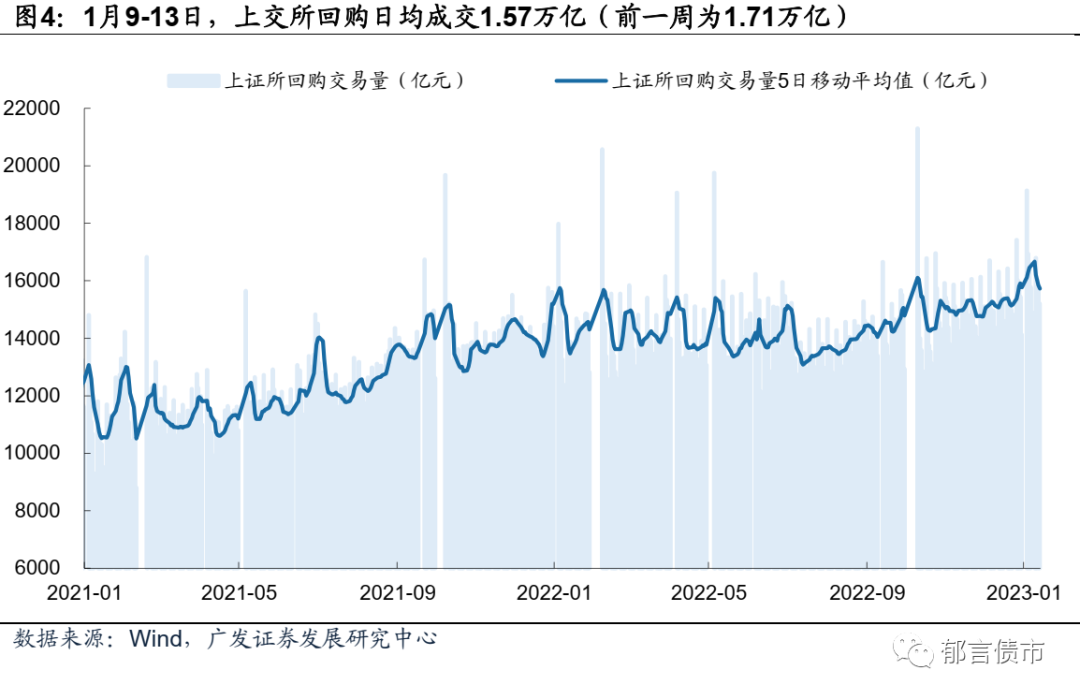 银行间质押式回购成交量继续回升。1月9-13日,银行间质押式回购成交量平均值为6.93万亿元,较前一周的6.51万亿元继续回升,周一成交量超过7万亿元,周二到周五成交量在6.68-6.99万亿元区间。隔夜成交量也同步回升,当周平均值为6.21万亿元(前一周为5.78万亿元),除周三外,其余每天隔夜成交量均超过6万亿元。