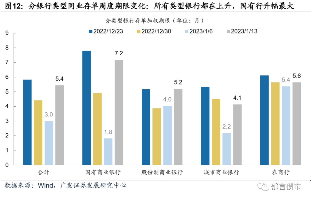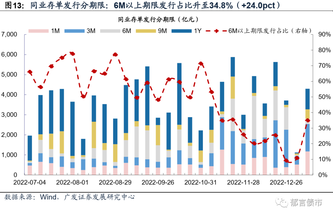 存单加权发行利率为2.48%,加权期限拉长至5.4个月。1月9-13日,同业存单加权发行利率2.48%,较前一周上行27bp。存单加权发行期限拉长至5.4个月,前一周为3.0个月,所有银行加权发行期限都在上升,其中,国有行加权发行期限从1.8个月大幅升至7.2个月。1年期存单占分类型银行存单总发行量比例,合计23.8%(相对前一周+20.0 pct)。本周3M仍然是主要发行期限,同时9M和1Y期限发行量有所回升。