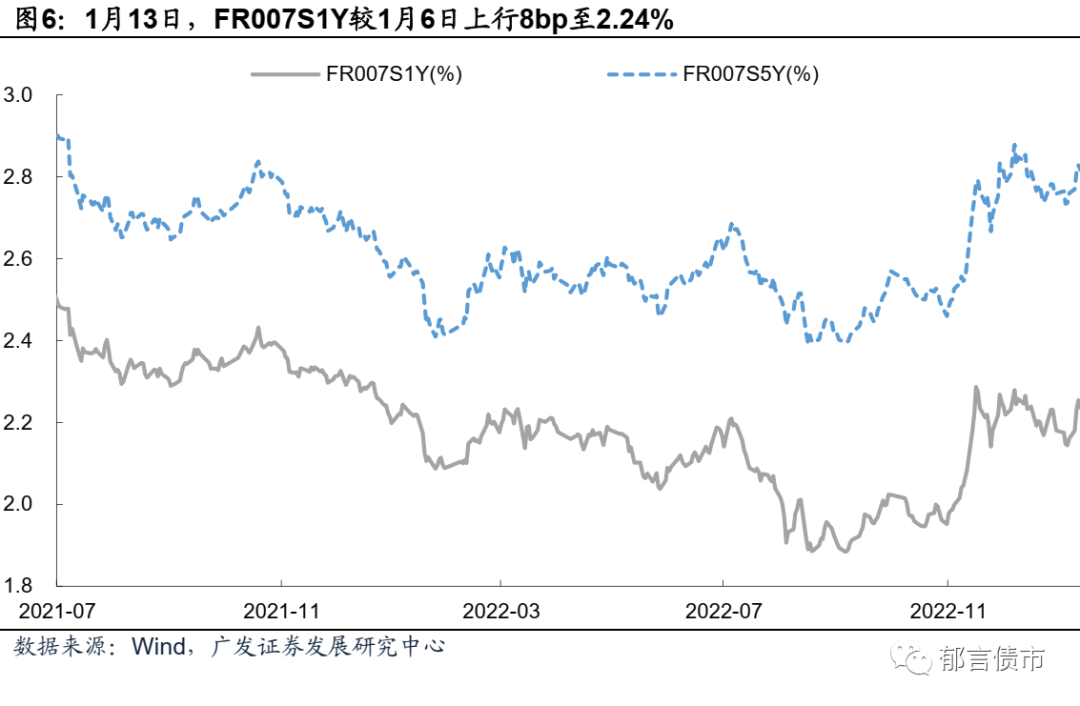 资金利率先上后下,中枢上行。1月9-13日,DR001和R001持续上行至周四后转为下行,周五分别为1.25%、1.39%,全周平均值较前一周上行34bp、33bp。而DR007和R007上行至周三后转下,周五分别下行至1.84%、1.98%,全周平均值较前一周上行41bp、27bp。