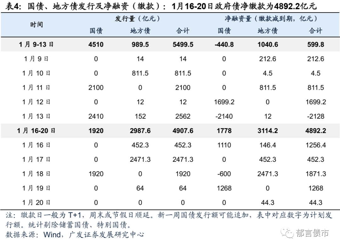 按缴款日计, 1月16-20日政府债净缴款(缴款剔除到期)为4892.2亿元。