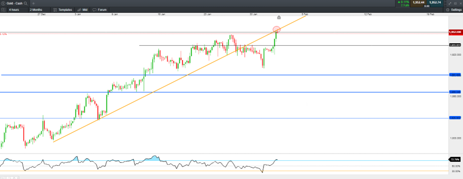 现货黄金刷新去年4月新高至1957.37美元/盎司。4小时级别在跌破1月上升趋势线后再次来到其阻力区域附近。4小时级别呈现RSI超买,日内或有修复需求。