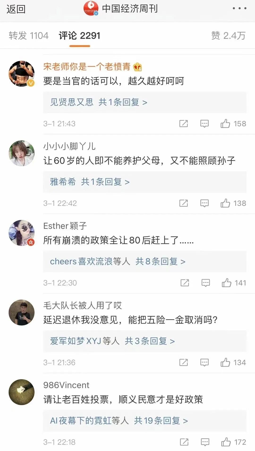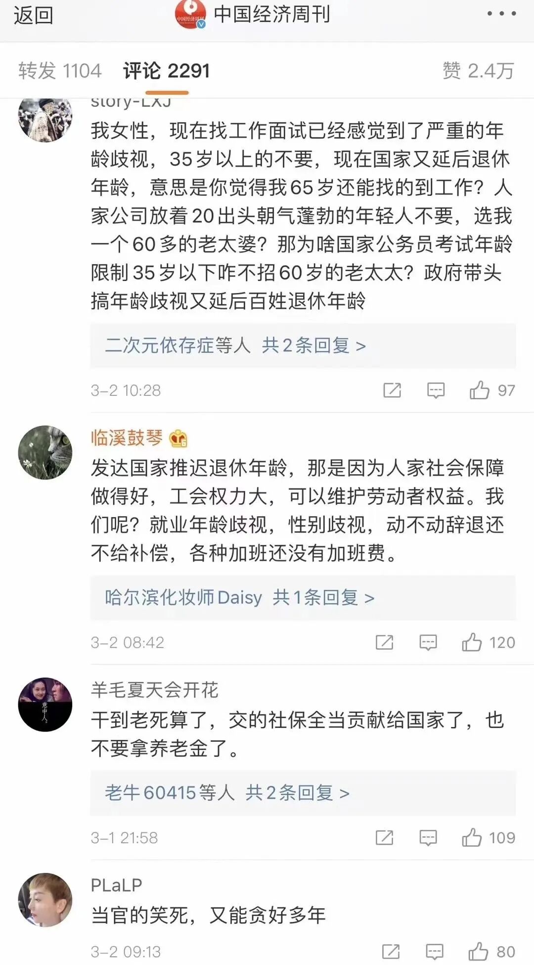 不知道延迟退休征求人民的意见没有,要是征求这些网民的意见,肯定通不过啦!