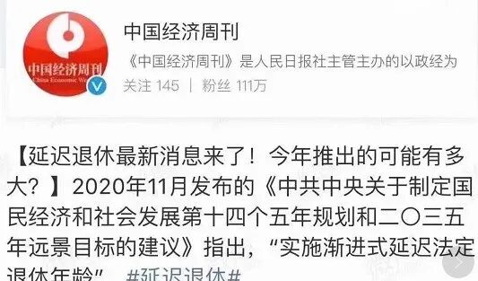 3月1日,人民日报社主办的《中国经济周刊》发布了“实施渐进式延迟法定退休年龄”的消息。