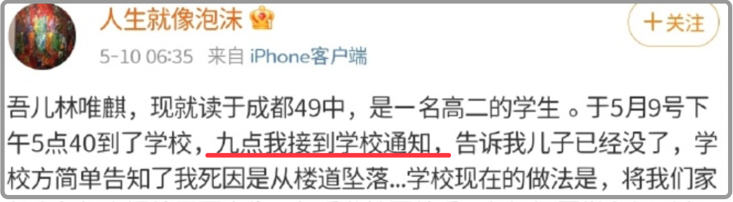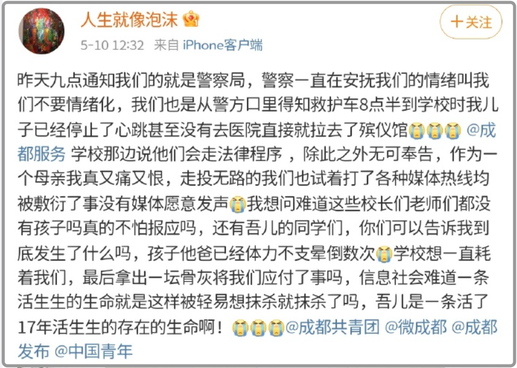 据这位学生的母亲(微博@人生就像泡沫)在网络上控诉称,学校在当天晚上9点简单通知了她,称她的儿子从楼道坠落死亡,但是其他情况都不再透露,而且监控也不给她提供,而且更让人匪夷所思的是,学校还将他们家长全部拒之门外,并警告其他学生对此事三缄其口: