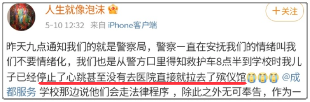 这位母亲还发文称,当天晚上8点半,救护车就已经到达学校,并把他的孩子拉去了殡仪馆: