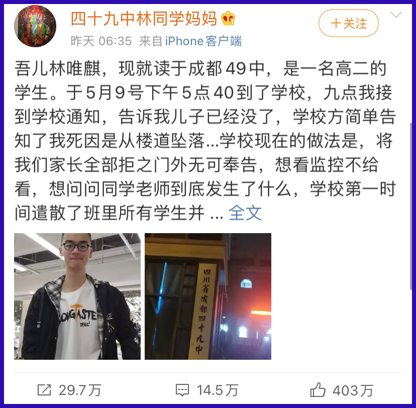 转眼四年过去,这个标题依然血淋淋地放在眼前。社会似乎并没有任何好转,只是李文星变成了林唯麒。这个成都四十九中的高二学生,一个成绩优异、阳光开朗的大男孩子,在5月9日母亲节这天永远地离开了他的母亲。从下午5时40分入校,到6时40分坠楼,仅仅一个小时,母子阴阳相隔。