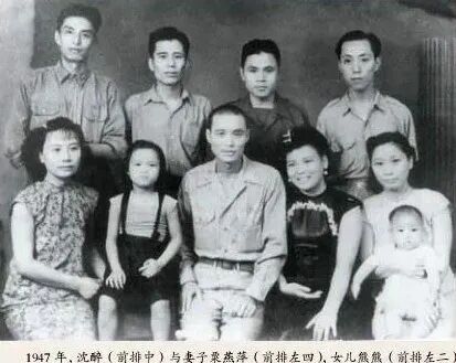 1947年,沈醉(前排中)与栗燕萍(前排左4)女儿熊熊(前排左2)1946年3月17日,戴笠坠机身亡,毛人凤接任军统局长,他将沈醉安排到云南,出任保密局云南站站长、少将专员。1949年12月,沈醉被起义的云南省主席卢汉扣押,在此期间为卢汉逮捕了在昆明的大多数特务,有当时在重庆执行完大破坏任务后逃至昆明等候飞去台湾的军统大特务徐远举,周养浩、郭旭等。后来沈醉被卢汉当成被俘战犯,囚禁在昆明陆军模范监狱,云南解放后被转移至重庆歌乐山白公馆战犯管理所,后同转去北京功德林战犯管理所。失去沈醉这个保护伞的栗燕萍,移居到香港居住,在沈醉断绝音信一年之后,栗燕萍便在香港改嫁。栗燕萍与沈醉所生的子女先后去了台湾,只有一个女儿沈美娟回到了新中国。1960年,沈醉在北京获得特赦,即向香港去信和托人传话,希望栗燕萍再回到他的身边了,但换来的却是一纸离婚协议。沈醉于1965年8月,与40岁的天主教堂修女杜雪洁登记完婚,这是沈醉的第三次婚恋了。虽然,沈醉经历过三次婚姻,令沈醉最为念念不忘的还是莫耶。当年,他被派往湖南临澧特训班当教官时,曾在《新华日报》上发表寻人启事,寻找莫耶下落。莫耶很快和沈醉取得联系并开始通信,虽然当时是国共合作时期,但延安需严加排查敌特,戴笠也反复告诫特训班师生不得与延安亲友通信。沈醉在信中多次提及希望莫耶离开延安重续旧情均遭拒绝,俩人不久便中断书信往来,从此人各天涯,沈醉才娶了栗燕萍。1948年秋,莫耶随《战斗报》调回延安,不久随第一野战军进军大西北。中华人民共和国成立后,任西北军区《人民军队报》主编、总编辑,1950年加入中国共产党。