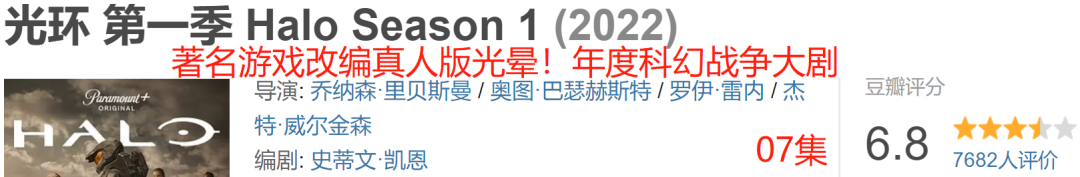 07集[公号发送 文末右下角【】内的文字查看]著名游戏改编真人版光晕来了!年度科幻战争大剧[光环]斯皮尔伯格担任执行制片人!巴勃罗·施瑞博尔扮演的士官长!讲述26世纪人类与被称为“星盟”的外星威胁之间史诗般的冲突,用动作、冒险和想象丰富的未来编织出深刻的个人故事。柯塔娜、凯瑟琳·海希博士、关·韩、玛姬、玛格丽特·帕拉贡斯基上将、索伦-066、演凯-125、莉兹-028、范纳克-134等亮相!第一季共9集每周4播出