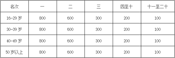 2、年龄分组奖:根据净计时成绩分别录取男/女前二十名(单位:人民币元);