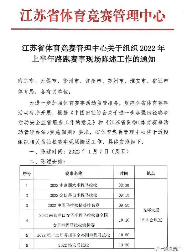 近日,根据传出的一份《江苏省体育竞赛管理中心关于组织2022年上半年路跑赛事现场陈述工作的通知》,2022年上半年江苏省拟举办的部分马拉松赛事将于2022年1月7日进行赛事的陈述工作。