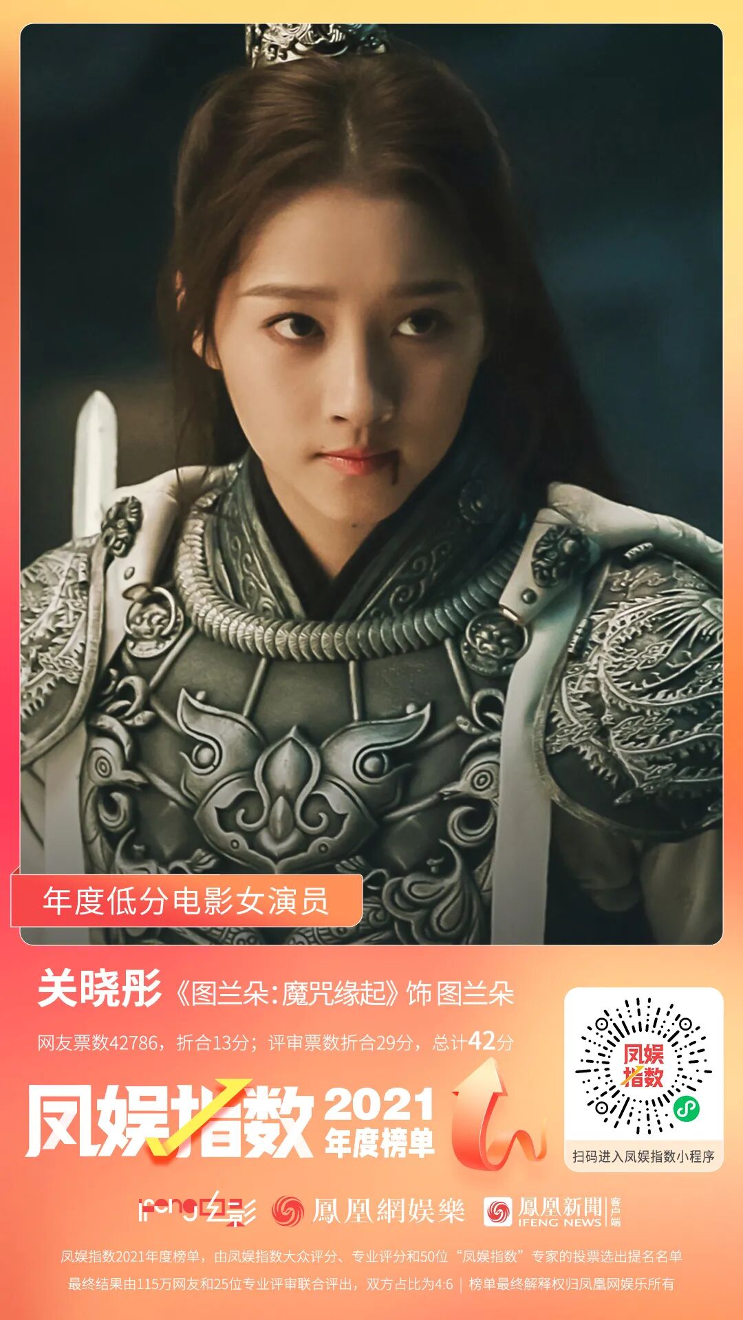 关晓彤网友票数42786,折合13分,评审票数折合29分,总计42分,在大众和专业投票上,均位列第一,被一致认为是年度低分电影女演员。