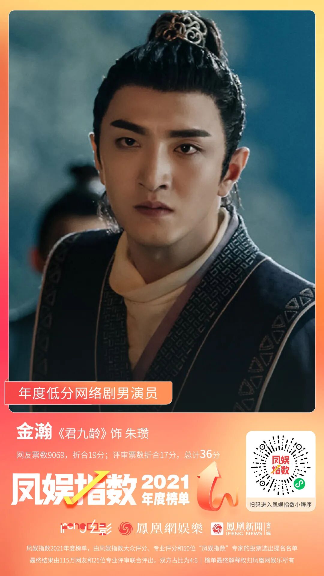 金瀚网友票数9069票,折合19分,评审票数折合17分,总计36分,在大众和专业投票上,均位列第一,被一致认为是年度低分网络剧男演员。