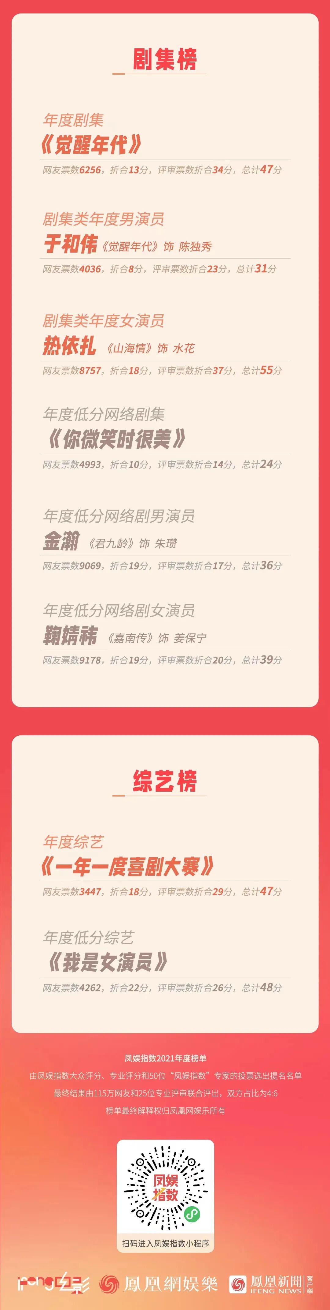 凤娱指数2021年度榜单的作品,来自2020年12月-2021年11月期间,凤凰网娱乐关注的电影、剧集、综艺作品,包括中国大陆院线公映的国产电影、中国大陆网络平台上线的国产剧集和国产综艺。