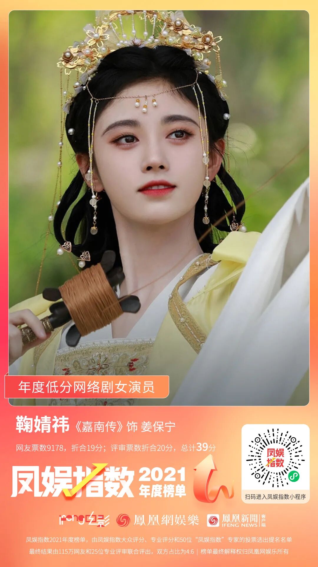 鞠婧祎网友票数9178票,折合19分,评审票数折合20分,总计39分,在大众和专业投票上,均位列第一,被一致认为是年度低分网络剧女演员。