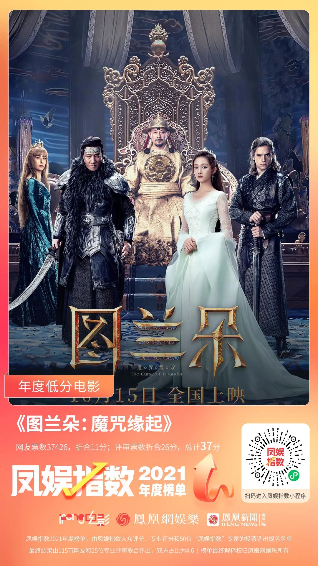 《图兰朵:魔咒缘起》网友票数37426,折合11分,评审票数折合26分,总计37分,在大众和专业投票上,均位列第一,被一致认为是年度低分电影。