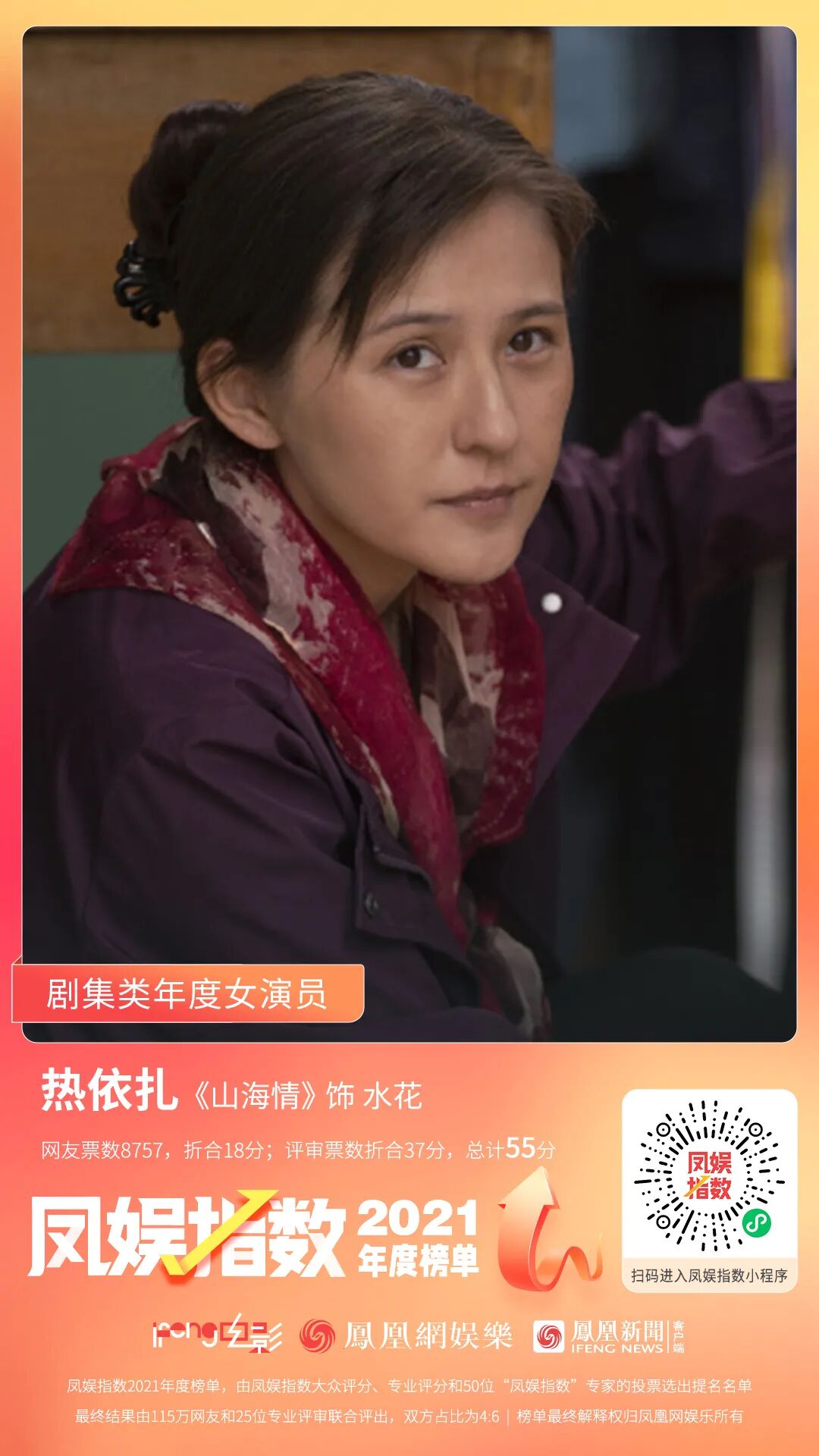 热依扎网友票数8757票,折合18分,评审票数折合37分,总计55分,在大众投票和专业投票中都取得了第一名,也是本次评选中得分最高的一位,受到观众和专业评审的一致认可。