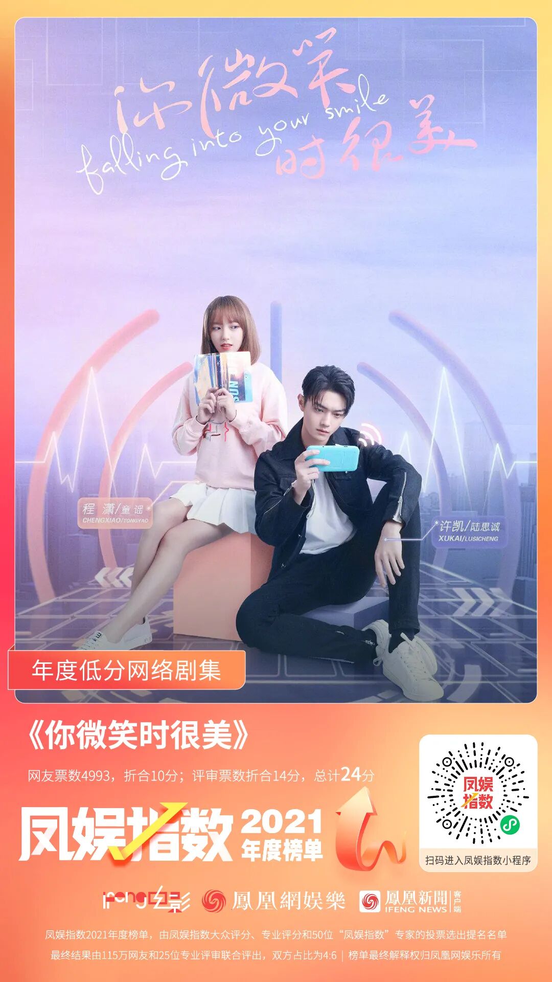 《你微笑时很美》网友票数4993票,折合10分,评审票数折合14分,总计24分。