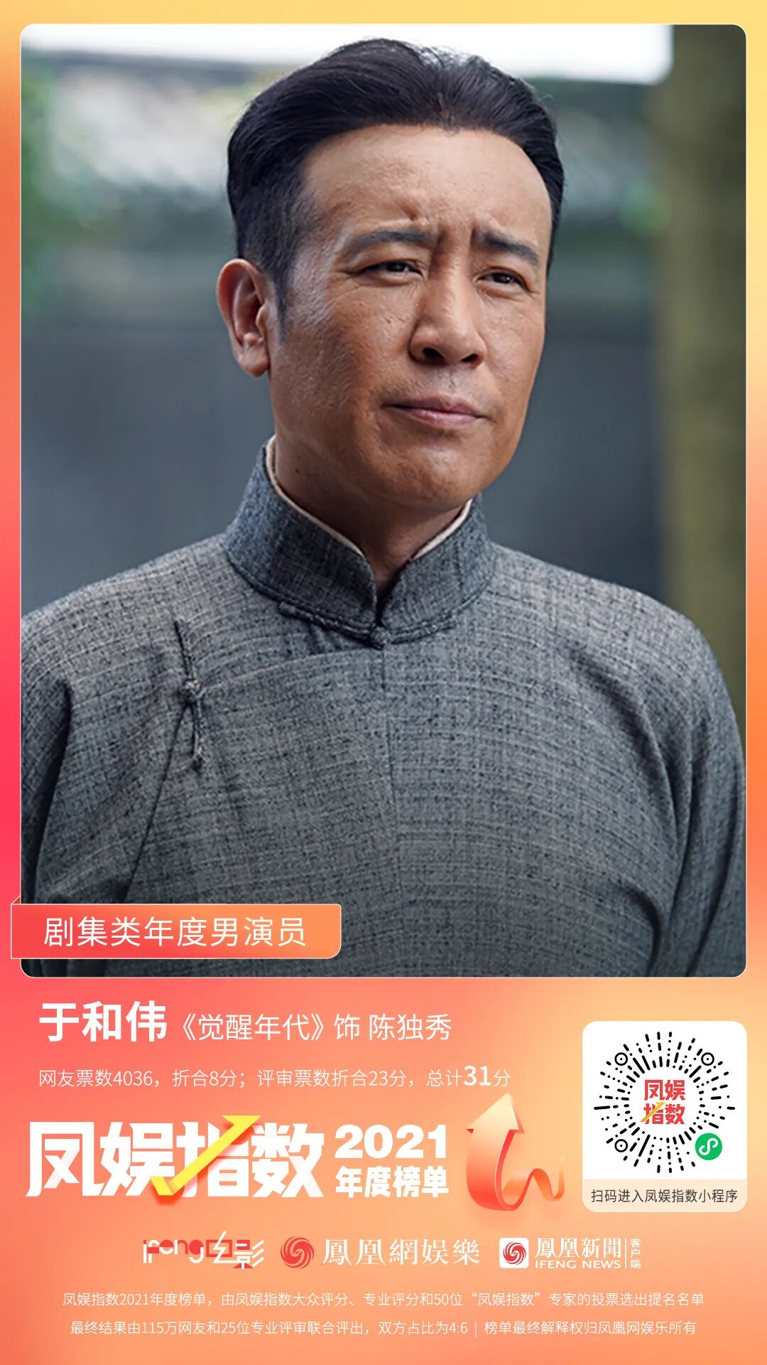 于和伟网友票数4036票,折合分数8分,评审票数折合23分,总计31分,在专业投票中取得了第一名。