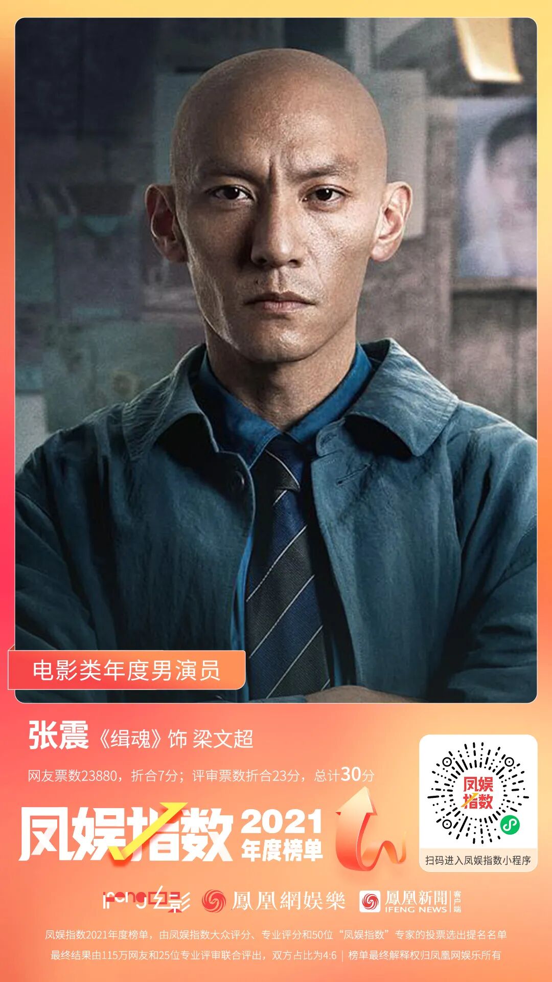 张震网友票数23880,折合7分,评审票数折合23分,总计30分,在专业投票中,他取得了第一名。