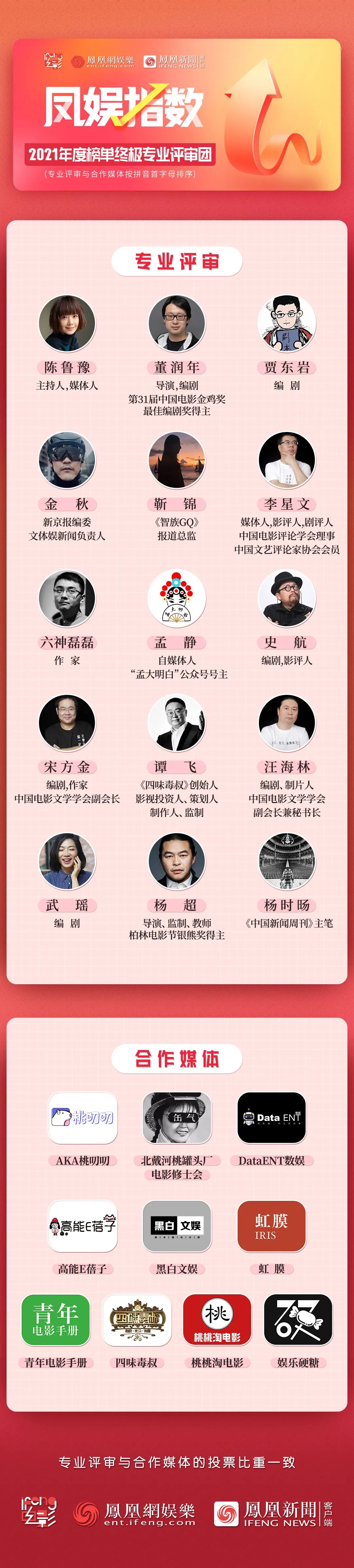 与此同时,包括导演、编剧、作家、媒体人、评论人在内的15位专业评审,与10家合作媒体一起,作为“终极专业评审团”,对电影、剧集、综艺三个榜单进行了投票评选。
