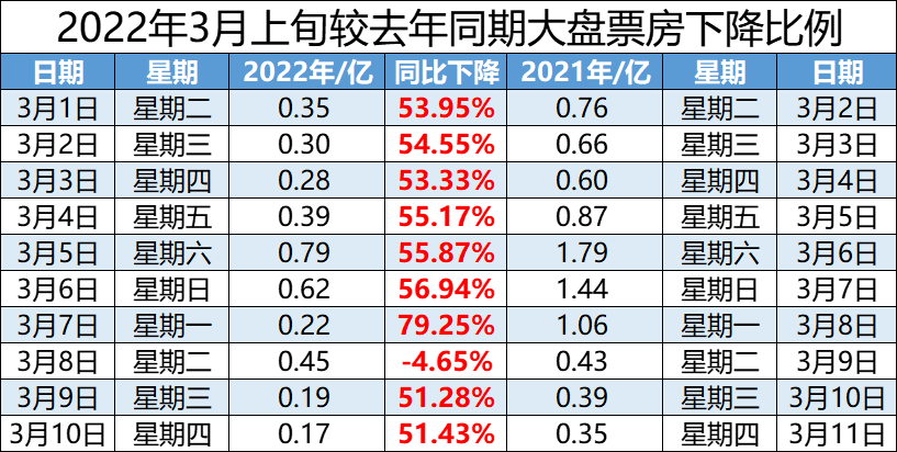 只看单日大盘票房的话,中国3月电影市场已下滑到10年前的水平。![]()