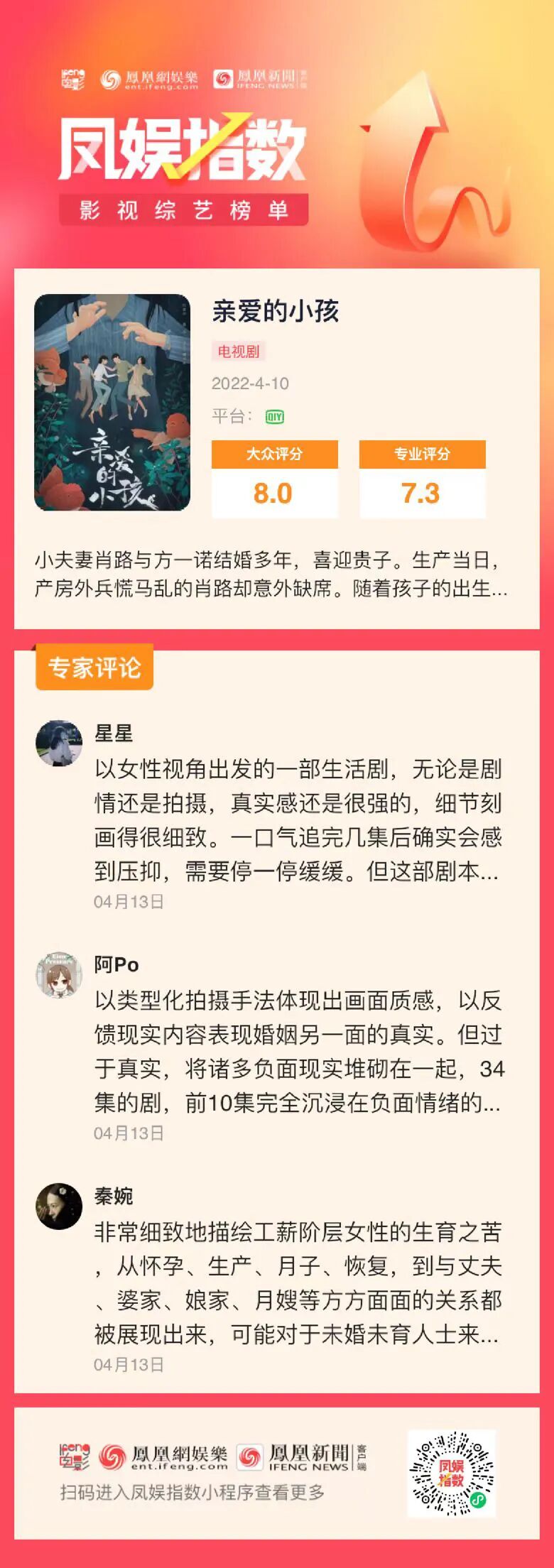 目前《亲爱的小孩》在“凤娱指数-影剧综榜单”小程序中大众评分8.0,专业评分7.3。你看过这部电视剧了吗?评价如何?欢迎扫码进入小程序打分~