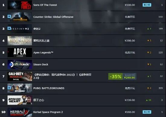 1、《森林之子》 2、《CSGO》 3、《命运2》 4、《霍格沃茨之遗》 5、《Apex英雄》 6、Steam Deck 7、《使命召唤19:现代战争2》 8、《绝地求生》 9、《原子之心》 10、《坎巴拉太空计划2》