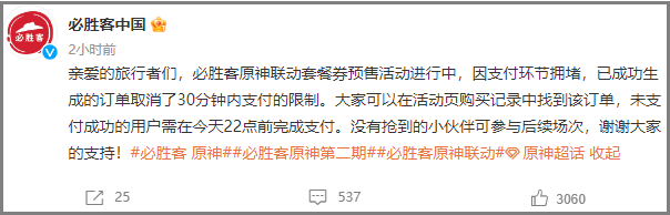 对此,必胜客中国发布微博回应,称因支付环节拥堵,已成功生成的订单取消了30分钟内支付的限制。大家可以在活动页购买记录中找到该订单,未支付成功的用户需在今天22点前完成支付。