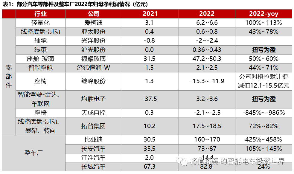 汽车板块业绩预告持续放出,优质公司业绩开始兑现,部分企业实现扭亏。从目前汽车零部件及整车厂公布的业绩预告情况来看,零部件企业爱柯迪、亚太股份、福耀玻璃、经纬恒润、拓普集团,整车企业比亚迪、长安汽车归母净利润均实现了较大的正增长;沪光股份和均胜电子本年度扭亏为盈。