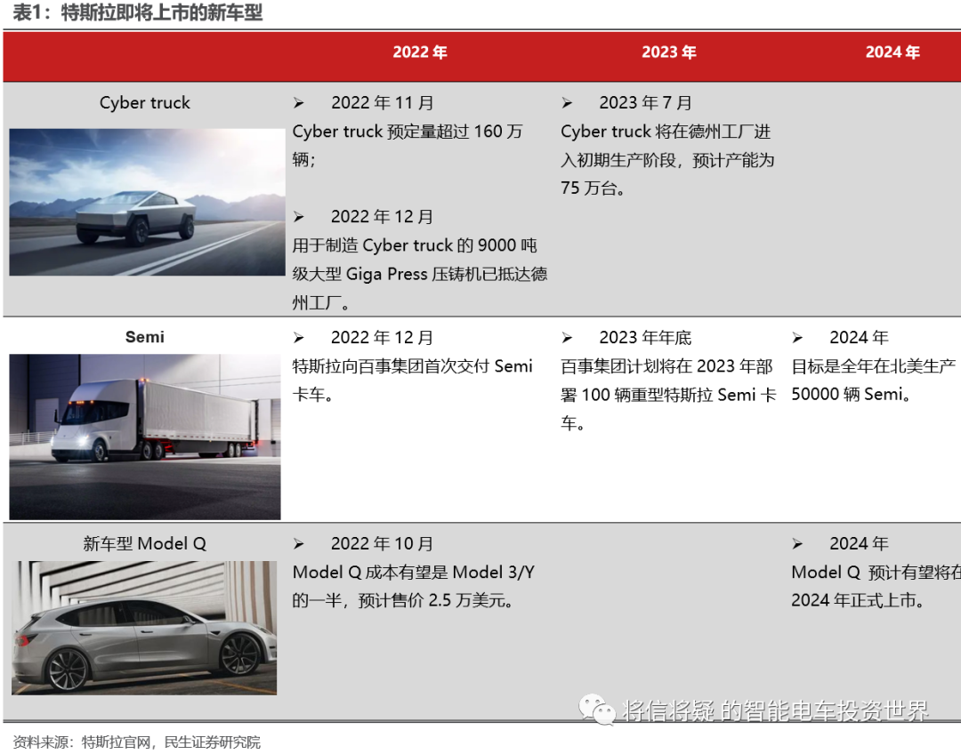 从销量上来看,2022年,特斯拉全球总交付量131万辆,同比+40%;生产137万辆,同比+47%。具体车型来看,Model 3和Model Y两款热销车型,2022全年生产130万辆,共计交付125万辆,其中上海工厂Model Y采用一体化压铸后底板大幅提升生产效率。2022年投入运营的美国得州超级工厂、德国柏林超级工厂,也正在全球范围内“复刻”上海超级工厂的生产效率与产业影响。据特斯拉财报,特斯拉2023年交付量有望达180万辆。同比+38%。