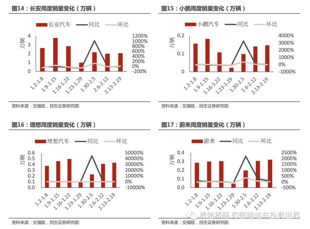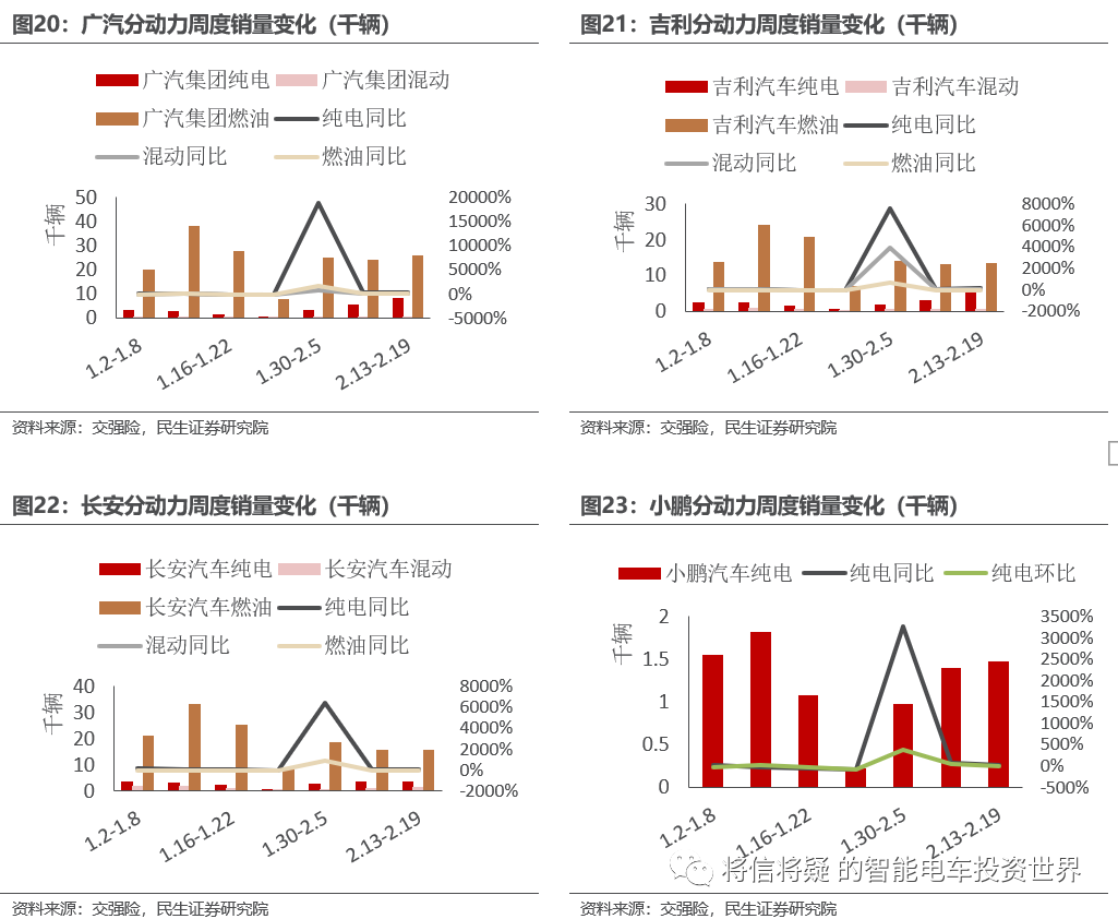 2月第3周(2.13-2.19)国内乘用车上牌30.8万辆,同比-11.7%/环比+8.7%;2月前三周(1.30-2.19)累计销售86万辆,同比+30.4%。比亚迪销售3.7万辆,同比+64%;广汽销售3.37万辆,同比-6%;长安销售2.05万辆,同比-10%;吉利销售1.9万辆,同比-11%;长城销售1.04万辆,同比-38%。