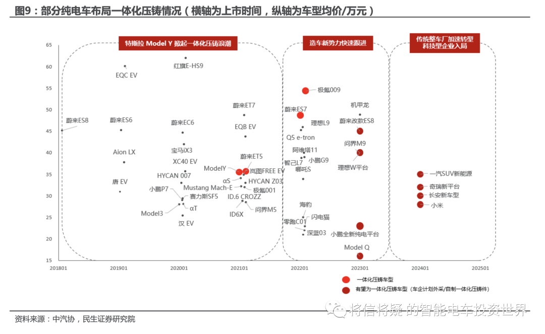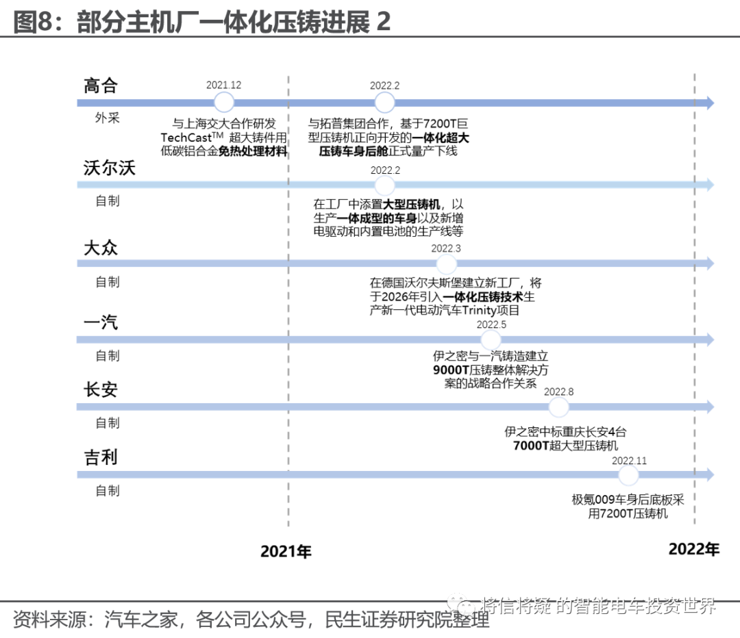 中高端电动车一体化压铸先行。以蔚小理为代表的造车新势力均已为旗下部分30万以上的纯电车或下一代平台布局一体化压铸,一体化压铸车型不断扩充,2024年搭载一体化压铸的车型有望快速放量。
