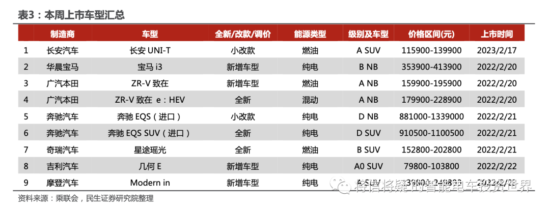 ➤本周汽车板块观点更新:【乘用车板块】节后需求回暖,供给端逐步发力,板块进入左侧配置时区。吉利发布中高端新能源品牌银河,预计未来两年将陆续推出7款车型,其中混动车型L7/L6、纯电车型E8将于今年Q2/3/4交付。2月开始重磅车型理想L7、秦 PLUS-DMi 2023冠军版陆续上市,供给端全面发力。1月行业去库后总库存降至334万台,库存端压力逐步缓解。周度数据来看,2月第3周国内乘用车上牌30.8万辆,环比+8.7%,需求端边际回暖。当前行业景气度边际企稳,后续伴随供给全面发力、库存压力趋缓、疫情后消费信心恢复,我们预计2023年3月行业景气度有望加速修复,板块将再次进入贝塔配置阶段。基于复苏期确认带来的板块估值修复为主要特征的配置机会,当前时点全面看多整车估值修复,推荐江淮汽车、广汽集团、长安汽车、比亚迪和长城汽车。