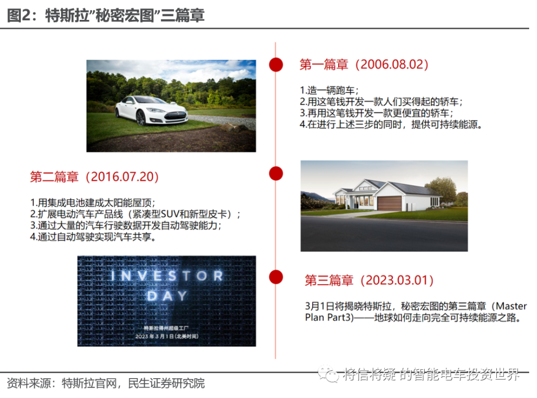 ➤ 特斯拉”秘密宏图”第三篇章将于3月1号公布,一体压铸有望加速。据马斯克计划,特斯拉2023投资者日活动将于3月1日在德州工厂举行,届时特斯拉将公布宏伟蓝图第三篇章。特斯拉”秘密宏图”的第一/二篇章分别于2006/2016年公布,涉及汽车制造、扩大电动车产品线、特斯拉能源部门的能源存储和可再生能源生产的整合、太阳能屋顶计划和自动驾驶技术等,截至目前,大部分战略规划都已完成。2022年3月马斯克曾透露第三篇章的相关信息,指出特斯拉的主旨将是扩展到极端规模。低成本车型的推出有望助力极端规模的实现,一体压铸、CTC技术及4680电池技术助力特斯拉成本控制,一体压铸有望加速。