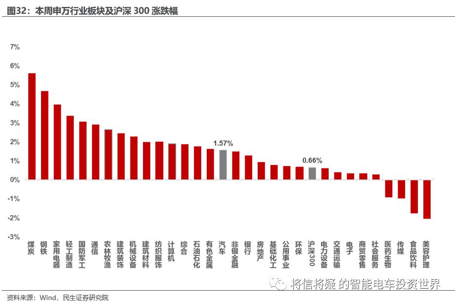 本周A股汽车板块(申万一级行业+1.57%),表现优于沪深300(+0.66%),在31个申万一级行业中排名第16位。细分板块中,商用载客车+3.11%、商用载货车+3.81%、其他交运设备-0.13%、汽车服务+2.97%、汽车零部件+1.96%、乘用车+1.96%。