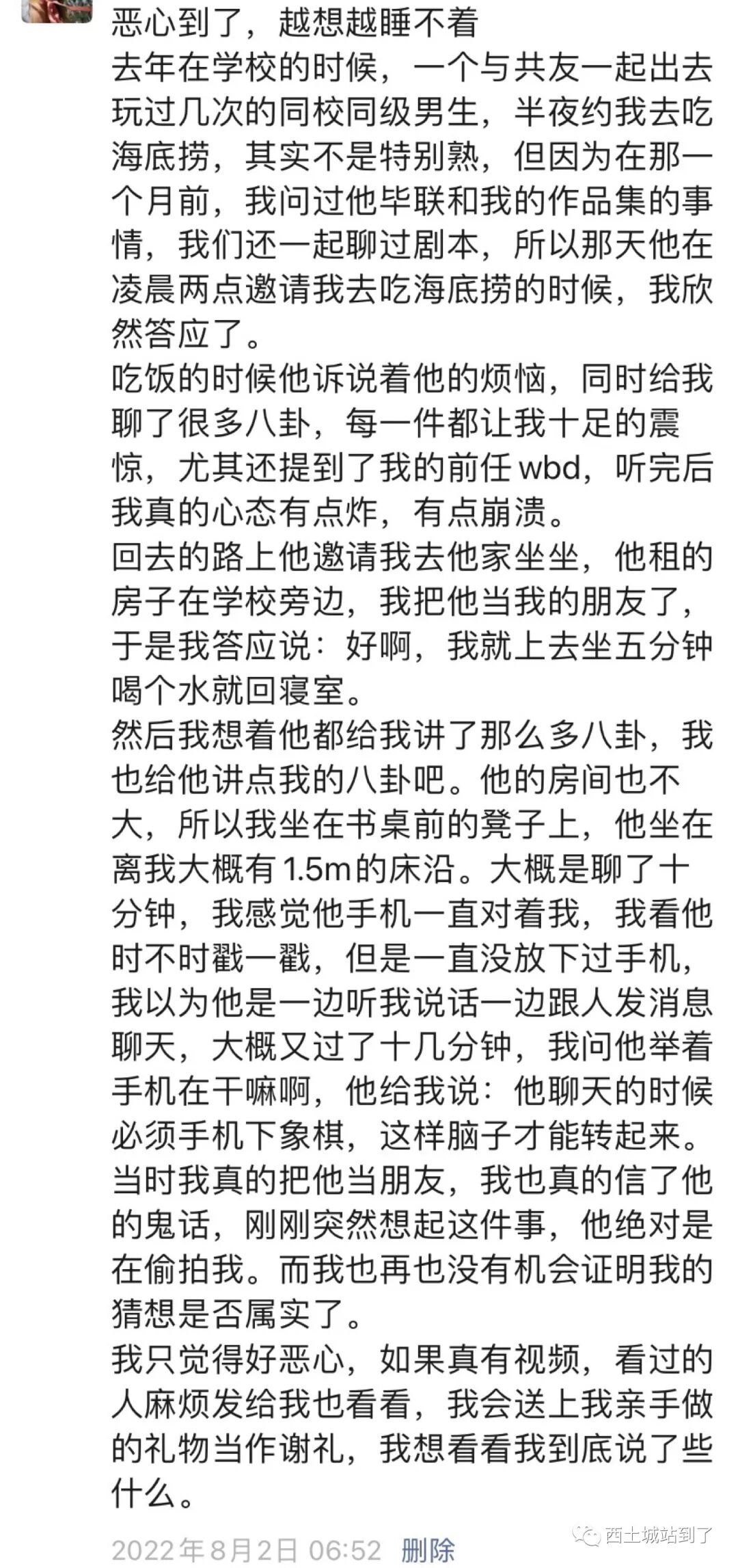 A自述道:“当时吃海底捞的时候,王鳆锐给我说,在2018年刚进校的时候,我的前任R和他的室友,加上两个导演系的女生,在宿舍4p,这件事让我心态崩了,我还很喜欢我的前任R,我不能接受这样的过往,可是又在心里默认了这件事的真实性,于是我很感激wfr愿意告诉我事实,所以后面他邀请我去他家坐坐的时候,我也没多想。在我和wfr一路坐车去他家的路上,我有强调我就是去坐两分钟,然后我会回寝室睡觉,他点点头没有说话。在进入他的出租屋后,他给我说他有性压抑,说他和前任们的性生活非常无趣,我刚好前段时间看过如何让女性糕潮的科普,于是我就很认真地用语言简单地教了他,我并不觉得这样的行为有任何情色意味,我只是单纯地在跟我的成年人朋友分享性知识,想让我的朋友性生活更加有趣。可是我万万没想到,他很有可能拍视频了。”剩下的故事在上文投稿人A的朋友圈里,已经阐述。