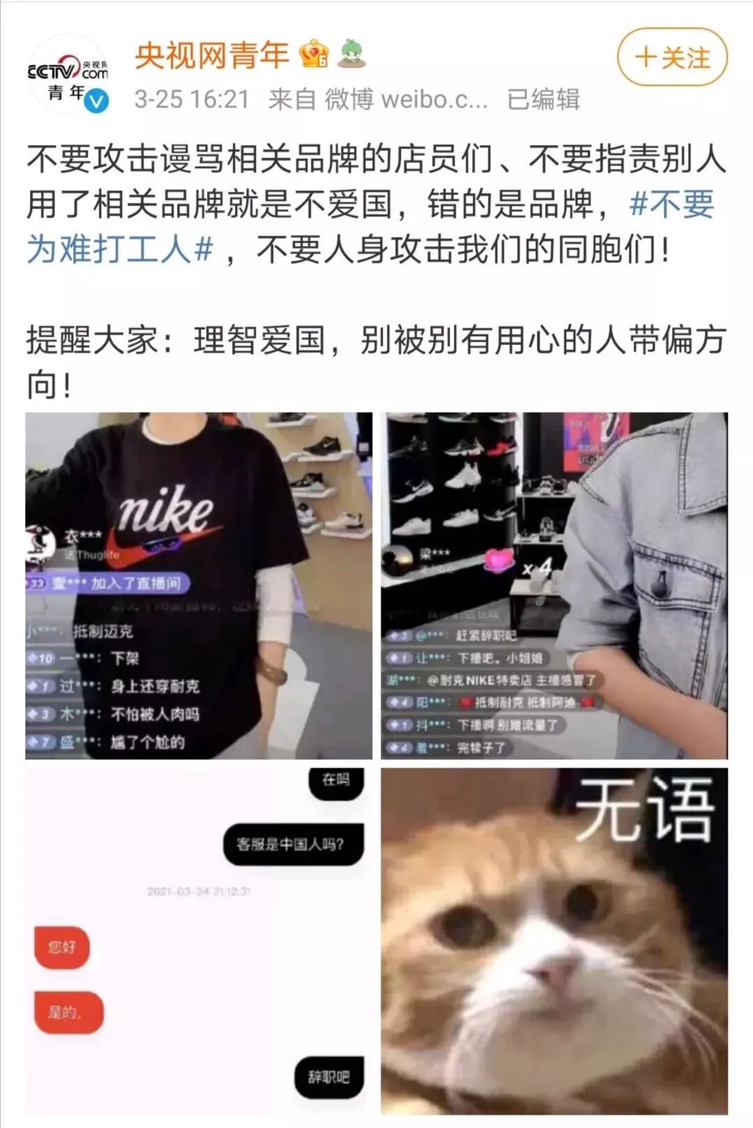 还有,所谓抵制,是从现在开始不消费这些企业的产品,而不是让你把原来已经买来的产品去烧掉撕掉,那些都是花了你自己的钱买来的,你如果要销毁,你还不如捐给贫困地区的老百姓,他们刚刚脱贫,可能正缺少衣服鞋帽呢,对不?更加需要提醒的是,所谓抵制,绝对不是让你看见有穿戴这些品牌的衣服鞋帽的人就上去威胁恐吓大骂甚至大打出手,有种上战场杀敌去,不要用你的荷尔蒙来做伤害同胞的蠢事。