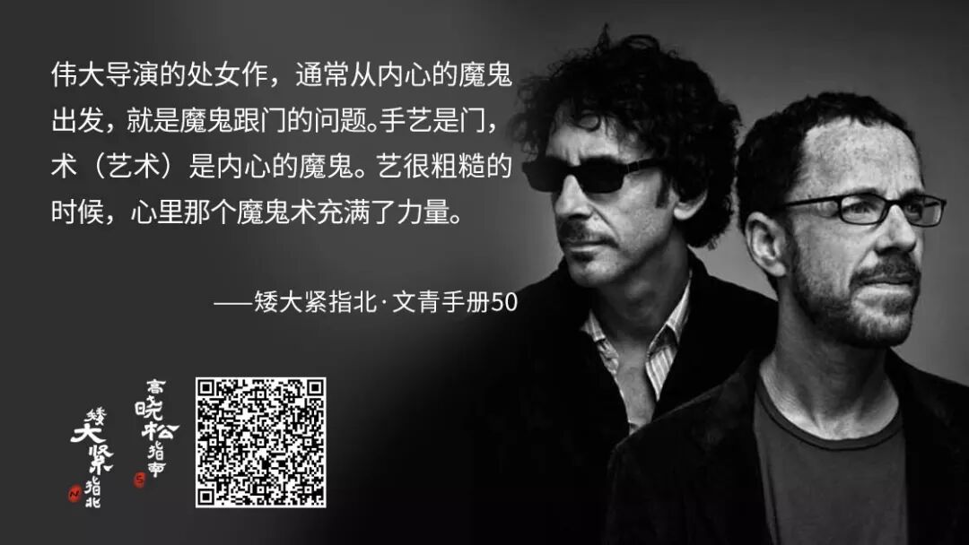 2. 你看昆汀的电影和看科恩兄弟的电影,最大的一个区别就是昆汀经常给你特别多惊喜,但是老让你担心。就是你看昆汀电影的时候,你老担心说这哥们今儿别过了,这部戏别拧巴了。但是科恩兄弟的电影,你坐那儿看你就心里特踏实,你就知道他俩一定不会让你失望。哪怕不是他们反响最好的,哪怕不是他们得奖最多的、票房最高的这些电影,比如说《醉乡民谣》,有人说好闷,我看着就觉得很感动。总而言之对他们有一种特别大的信任感,这个信任感不但超过昆汀,而且超过伍迪•艾伦。