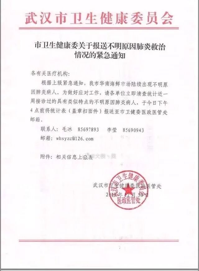 2019年12月1日,武汉金银潭医院收治首例疑似病例。12月30日,一份盖有武汉市卫生健康委员会医政医管处公章的红头文件在网络流传,紧急通知:“武汉市华南海鲜市场陆续出现不明原因肺炎”。