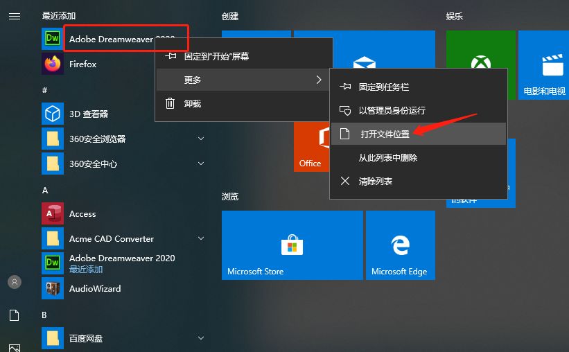6. 开始菜单找到Dreamweaver软件,右击软件打开文件夹位置。