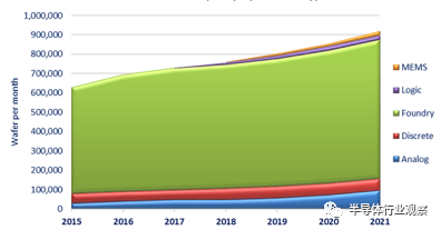 图 2:中国预计 200mm 晶圆厂产能,按产品类型分。来自 SEMI Global 200mm Fab Outlook, 2017.