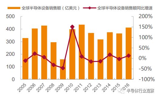 晶圆出货量的大幅增加和晶圆加工技术水平的提高势必在未来几年对半导体加工设备形成持续性的需求, 全球半导体设备迎来新一轮投资热潮。 2016 年全球半导体设备销售额为 412 亿元,同比增加 13%,为 2012年以来的阶段性新高。