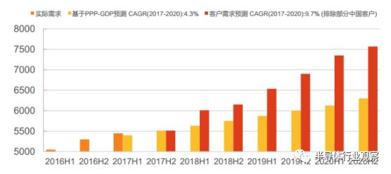 根据 SUMCO 公司预计,未来三年 300mm 硅片需求将持续增加。 2020 年新增硅片月需求预计超过 750 万片/月,较 2017 年增加 200 万片/月以上,需求提升 36%,从 2017-2022年复合需求增速超过 9.7%,值得注意的是,以上测算需求还没有考虑部分中国户。