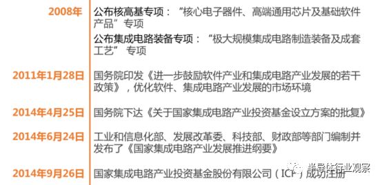 我国半导体行业的政策支持体系建设最早始于 2008 年。在国务院发布的《国家中长期科学和技术发展规划纲要(2006-2020 年)》中,包括了 16 个国家科技重大专项,每个专项投资数百亿元,目前已公布其中 13 个。 从纲要所制定的发展目标来看,我国半导体行业的国产替代大战略将分成两个步骤进行,第一步是在 IC 制造、 IC 封装测试方面将实现率先突破,第二步是在 IC 设计、设备和材料这 3 个方向上实现全方位突破,提升我国半导体行业整体制造水平。为了实现这一目标, 2014 年 9 月 26 日国家集成电路产业投资基金股份有限公司(ICF)成功注册。 两个重大专项的建立、《纲要》的发布与 ICF 的成立,使得集成电路产业成了国内新兴行业中最为政策体系支持的重点行业之一。